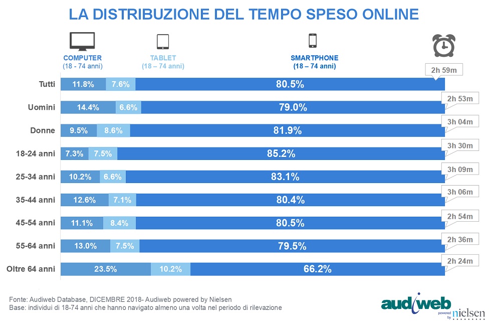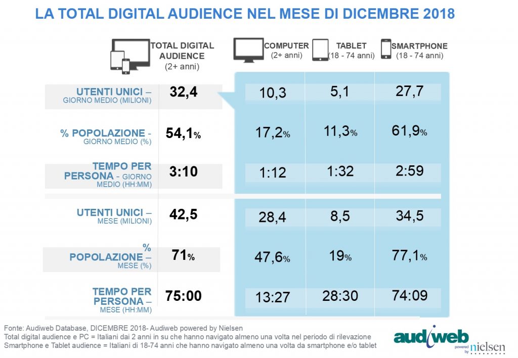 La total digital audience nel giorno medio è rappresentata da 32,4 mlioni di utenti e, come per i mesi precedenti, anche a dicembre emerge in modo significativo l’uso di smartphone per accedere alla rete, che si traduce in 27,7 milioni di utenti unici, pari al 61,9%% della popolazione tra i 18 e i 74 anni, online in media per quasi 3 ore al giorno.