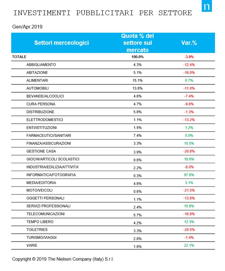 Il mercato degli investimenti pubblicitari in Italia chiude il mese di aprile leggermente in negativo, -0,5%, rispetto allo stesso periodo del 2018, portando la raccolta nel quadrimestre in parità. Lo segnalano i nuovi dati Nielsen, nei quali si segnala che, se si esclude dalla raccolta web la stima Nielsen sul search, social, classified (annunci sponsorizzati) e dei cosiddetti “Over The Top” (OTT), l’andamento nel periodo gennaio – aprile si attesta a -3,9%.