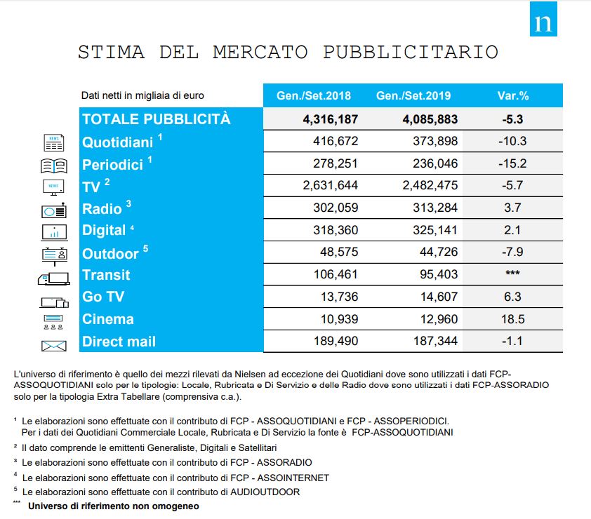 Il mercato degli investimenti pubblicitari in Italia chiude il mese di settembre in positivo, +1.8% rispetto a settembre 2018, mantenendo la raccolta nei primi 9 mesi in negativo del -0.9%. Lo segnalano i dati Nielsen. Secondo l’analisi, se si esclude dalla raccolta web la stima Nielsen sul search, social, classified (annunci sponsorizzati) e dei cosiddetti ‘Over The Top’ (OTT), l’andamento nel periodo gennaio – settembre si attesta a -5,3%.