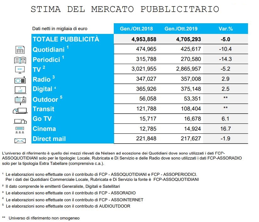 Il mercato degli investimenti pubblicitari in Italia chiude il mese di ottobre in positivo, +0,6% rispetto a ottobre 2018, mantenendo la raccolta nei 10 mesi in negativo del -0.7%. Lo certificano gli ultimi dati Nielsen (.pdf). Se si esclude dalla raccolta web la stima Nielsen sul search, social, classified (annunci sponsorizzati) e dei cosiddetti ‘Over The Top’ (Ott), l’andamento nel periodo gennaio-ottobre si attesta a -5,0%.