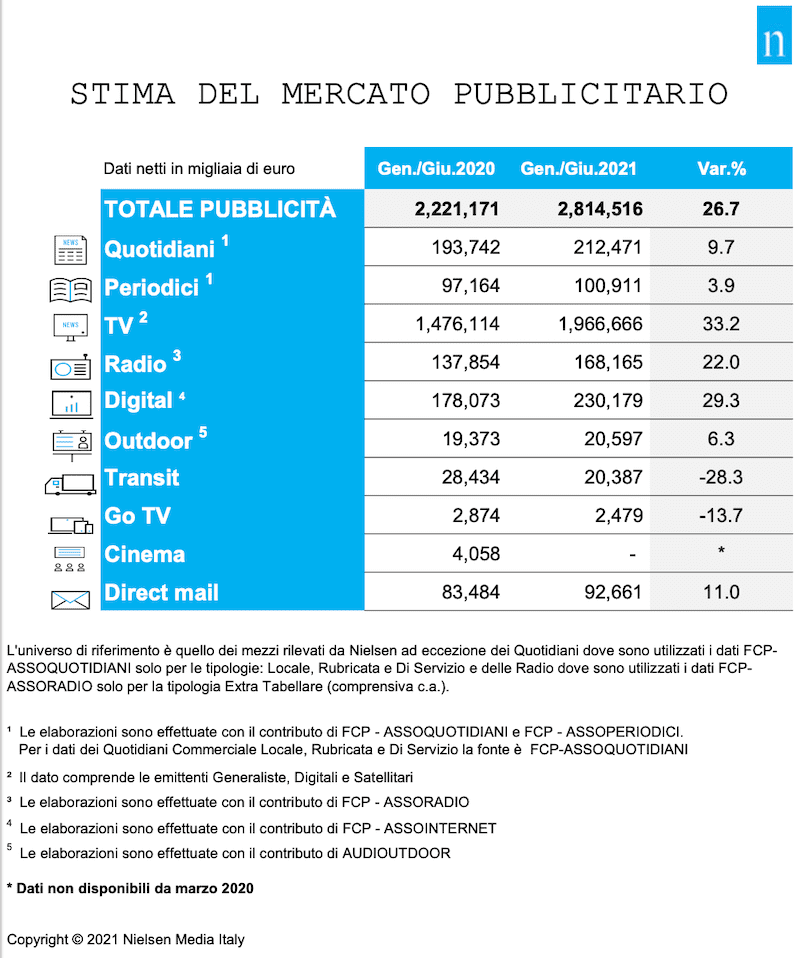 Il mercato degli investimenti pubblicitari in Italia chiude anche il mese di giugno con una crescita sensibile +34,6% rispetto allo stesso periodo del 2020, portando la raccolta pubblicitaria del primo semestre a +25,7%. Se si esclude dalla raccolta web la stima Nielsen sul search, social, classified (annunci sponsorizzati) e dei cosiddetti “Over The Top” (OTT), l’andamento nel periodo gennaio – giugno si attesta a +26,7%.
